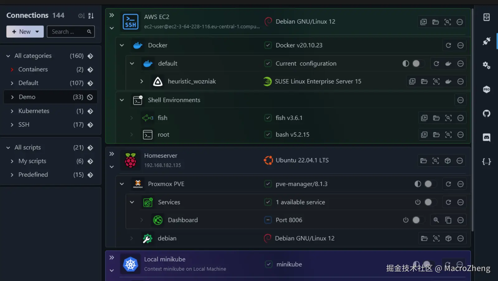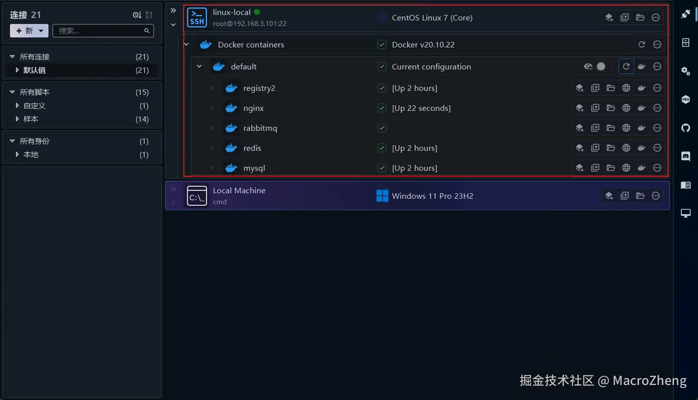 - 连接中心:能轻松实现所有类型的远程连接,支持SSH、Docker、Podman、Kubernetes、Powershell等环境。