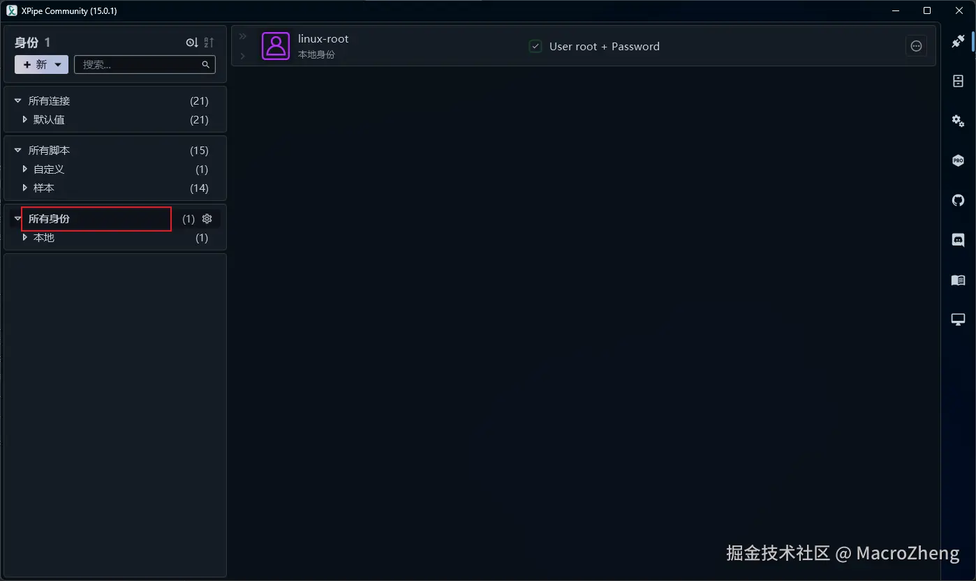 所有身份中存储着我们的账号密码,之前创建的Linux root账户在这里可以进行修改。