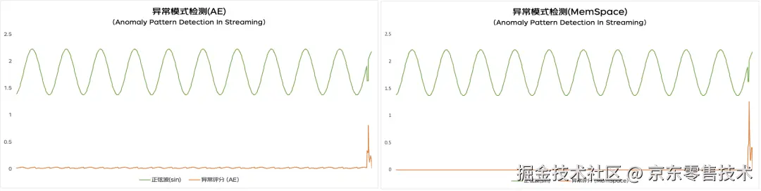 如上图所示,左边是MemStream论文中的实验效果,右边是基于自隔离机制(self-isolation)后的实验效果,通过对比,能直观的看出通过基于自隔离机制方法,在概念漂移测试数据的效果上更为显著。3、周期序列检测测试背景: 基于Mars公开数据集5中序列数据,进行长周期序列(周期性+局部)的异常检测。如下左图所示的周期性异常,主要表现为该周期相对历史周期出现了明显增大的特点,基于序列长周期依赖关系基础上产生的异常。而右图的局部异常则是基于重复该序列末尾8个点数据构造而来。