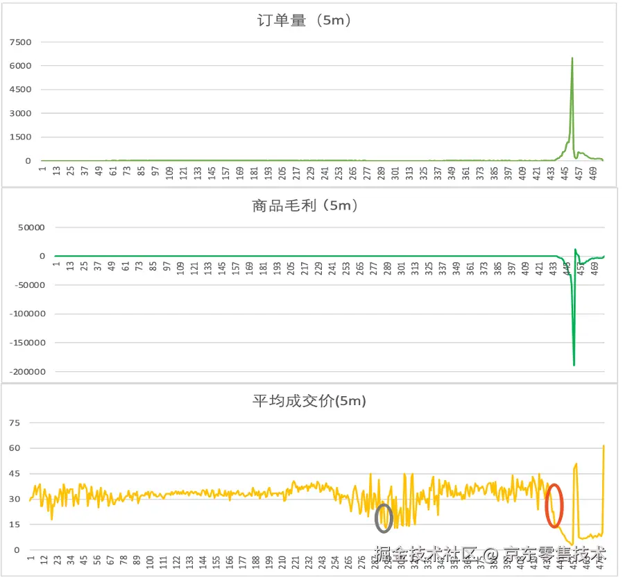 ****测试背景: 基于风控一站式巡检(业务健康度)场景,进行异常模式(pattern)的检测,涉及线上业务规则或模型的时序流数据。主要维度: 1分钟请求量、1分钟命中量两个维度。测试评估: 如上图所示,左右两边分别是基于自编码器(AutoEncoder)和记忆空间(MemSpace)技术框架的检测结果。原始序列流中,命中量随着请求量数据上升或下降趋势的变化而变化,当在末尾处,这种关联的趋势发生了明显改变,请求量出现急剧下降时,命中量却出现了明显的上升趋势变化,此时异常评分均较高,说明基于自隔离机制的方法,也能有效检测这种多维时序的趋势变化,对比历史趋势,属于异常模式(pattern)。5、价格风险案例案例背景: 历史价格风险案例中,A商品因每满减促销叠加多张券导致低价风险事件。主要维度: 5分钟的平均成交价、5分钟订单量、5分钟的商品毛利三个维度。正常数据流(初始化): 基于发生价格风险事件的商品,过去一天的正常销售数据进行算法模型的初始化,总计256个样本数据,其正常数据流的序列分布如下: