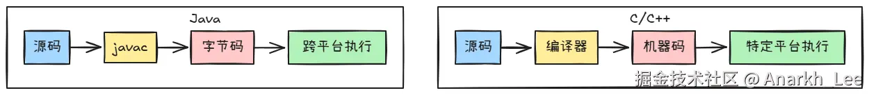 - 解释:字节码→机器码(平台相关)