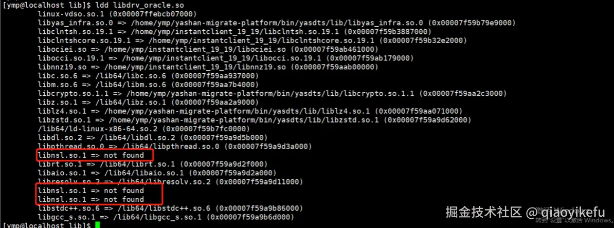 3、检查 libdrv_oracle.so 还有哪些依赖库没有安装,检查结果是只少 libnsl.so.1 库