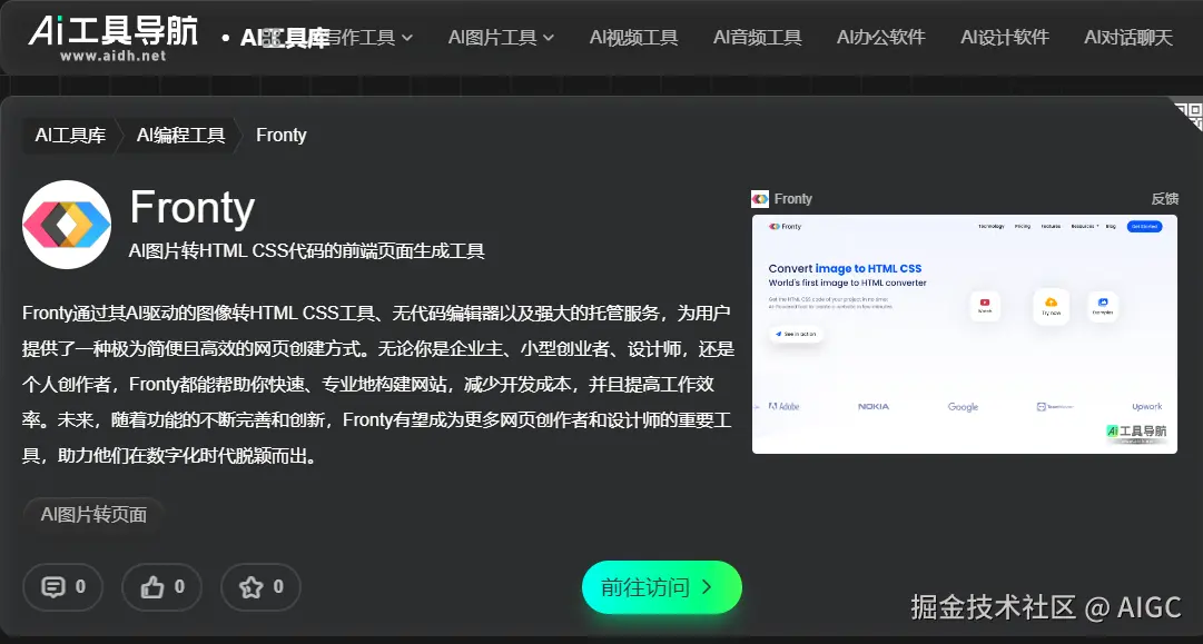 在前端开发领域,效率与创新一直是推动行业发展的核心要素。 AIDH.NET AI工具库作为一个汇聚众多实用AI 工具的宝库,其中 Fronty、Deco 和 Quest 这三款工具,正以独特的技术优势和强大的功能,为前端开发带来前所未有的变革。它们不仅简化了开发流程,还提升了开发质量,让前端开发者能够更高效地实现创意,快速响应市场需求。