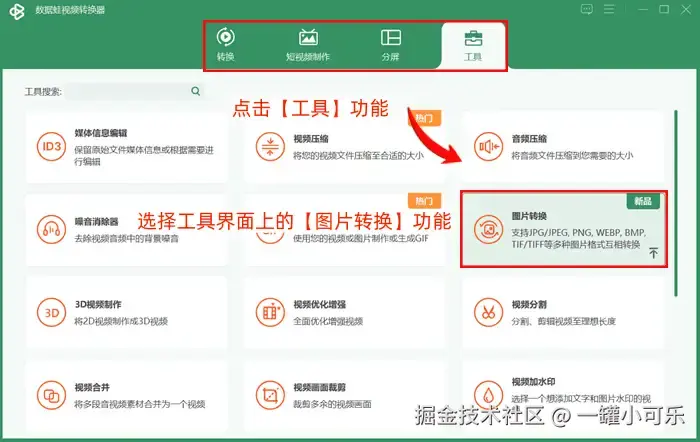 ① 进入数据 蛙视频转换器的主页中,点击界面上的【工具】功能,然后选择工具界面上的【图片转换】功能。