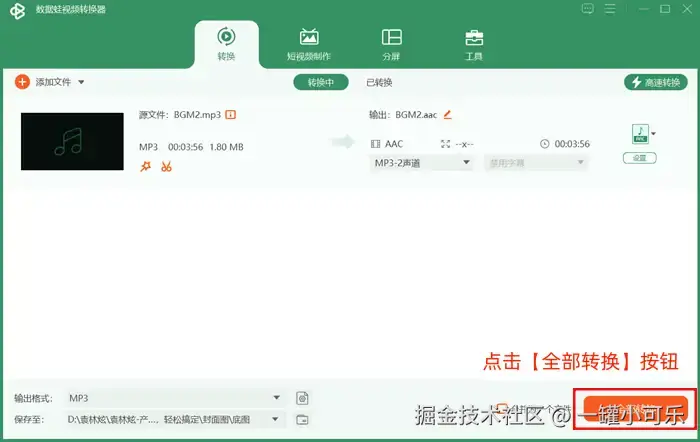 第三步:选择好目标格式后,点击转换界面右下角的【全部转换】按钮,等待转换完成后,该应用会自动弹出已经转换好的音频文件。