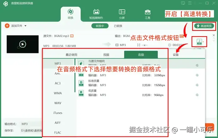 第二步:点击开启格式转换列表中的【高速转换】按钮;然后点击文件格式按钮,打开格式选择窗口,在音频格式下选择想要转换的音频格式。