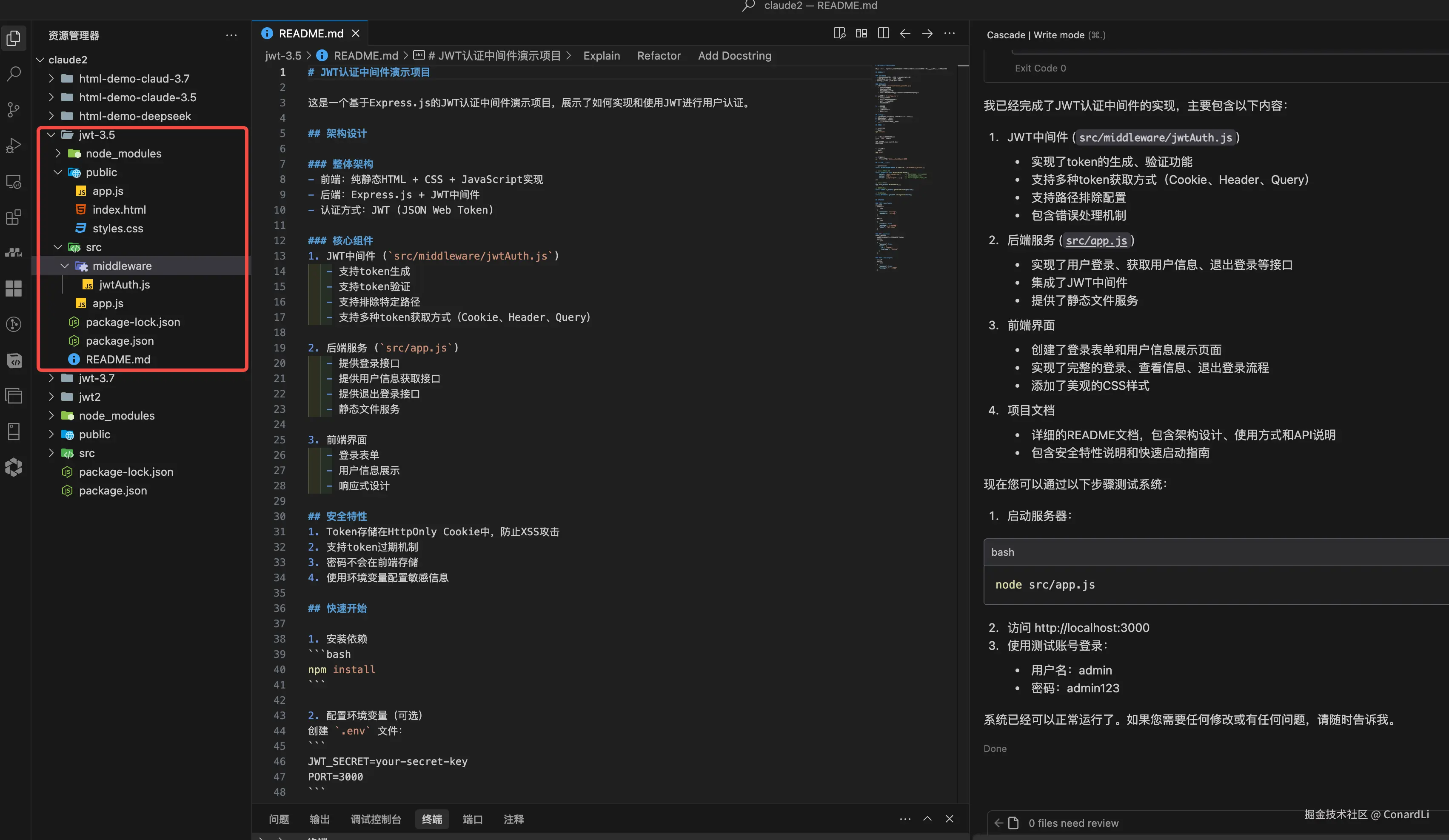 我们再来看下 Claude 3.5 的编写结果:首先从目录上看,生成的项目就简单很多了: