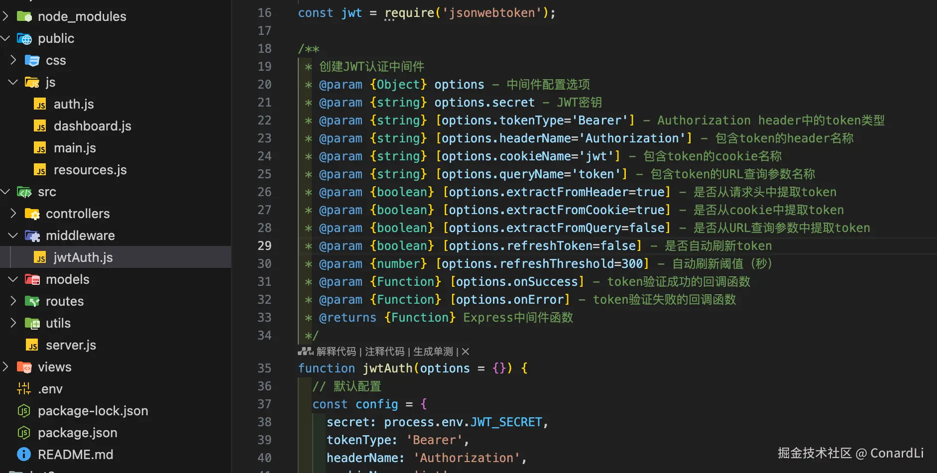 我们再来看看具体的技术实现,下面是模型生成的 jwtAuth 函数的主要参数,可以说考虑非常全面了: