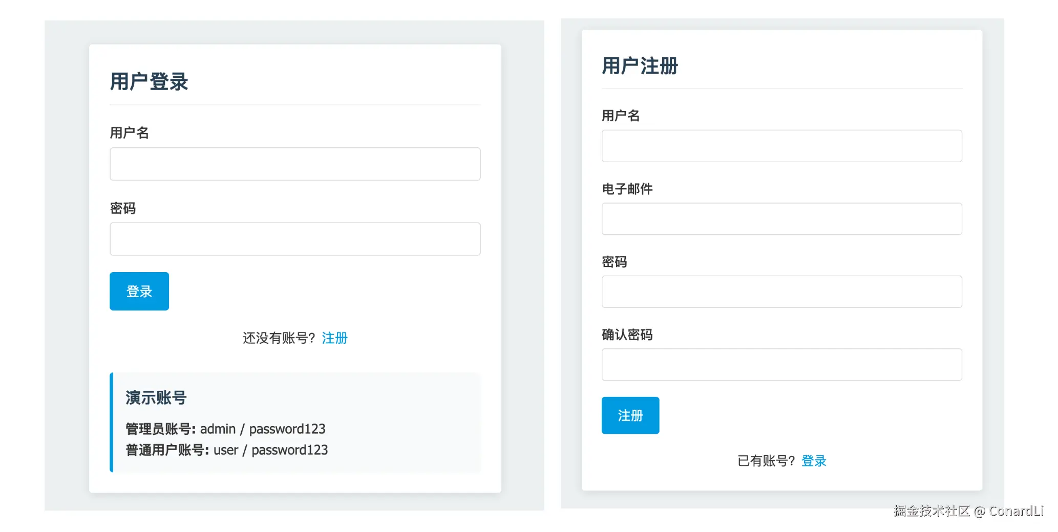 甚至还实现了完整的登陆登出和注册功能: