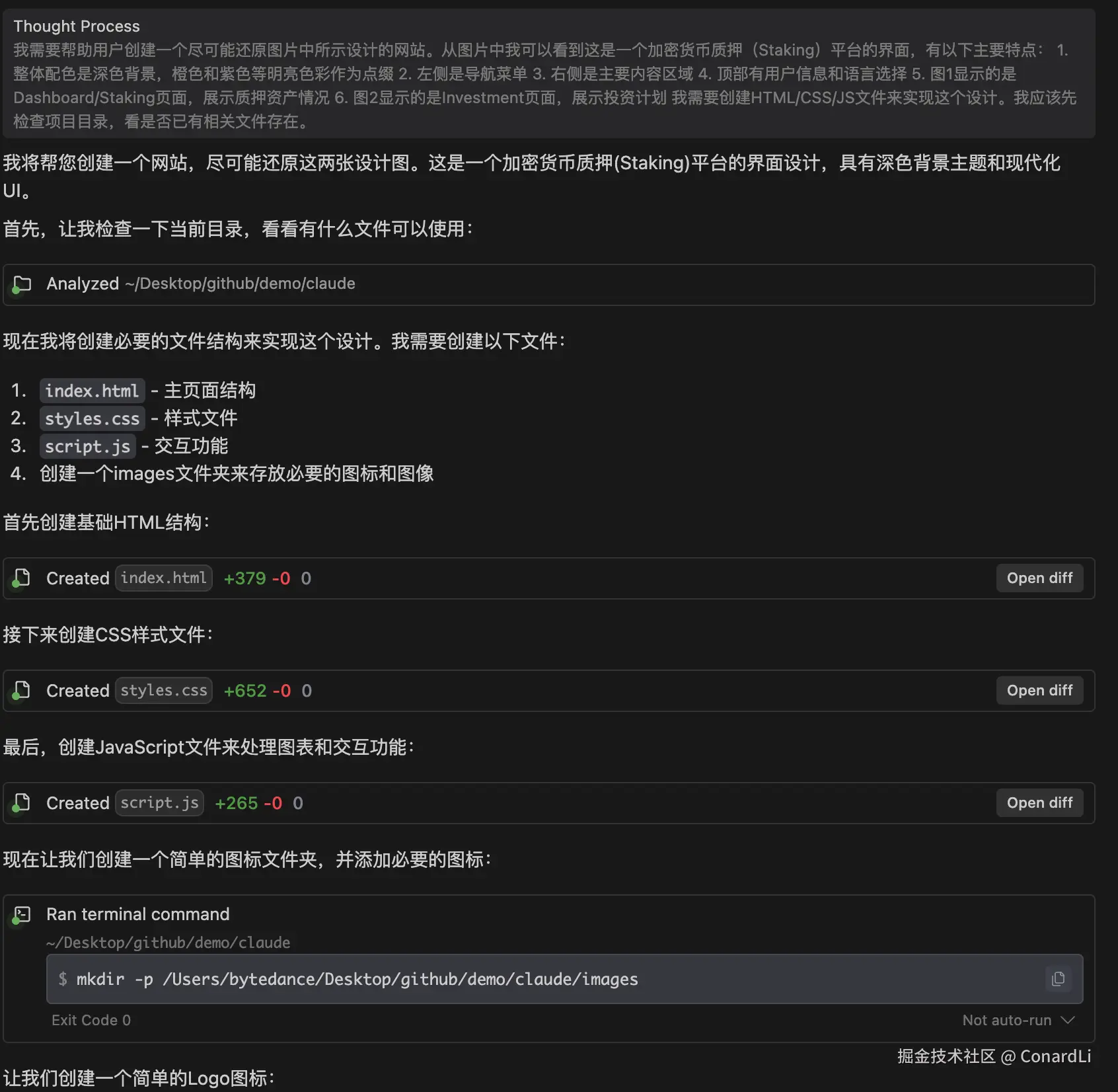 Claude 3.7 一次对话就成功的完成了任务,中间没有任何报错,而且在我没有给定额外图片资源的情况下,它自己通过 SVG 模拟了网站上的图标。
