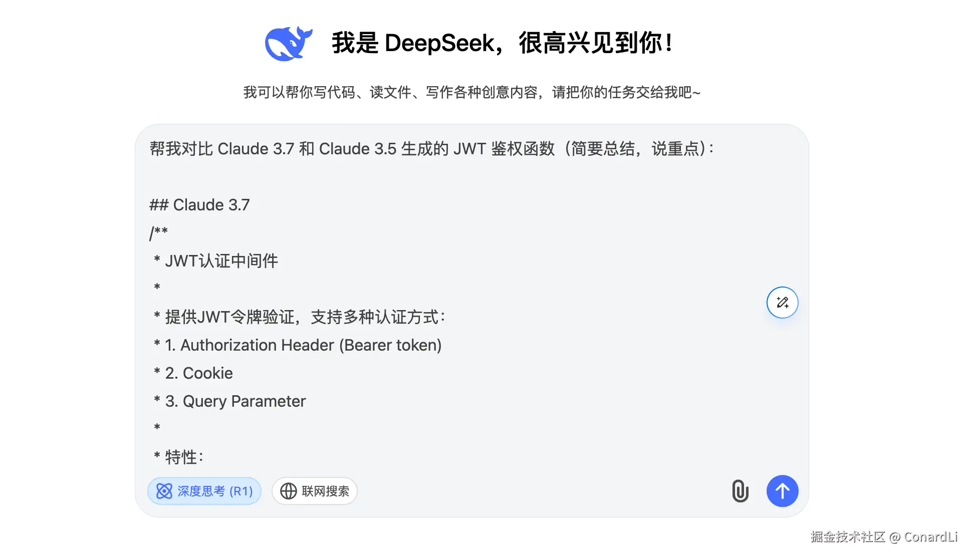 从工程的生成的完整性来讲我们就不用多说了,很直观,Claude 3.7 完胜,下面我们让 DeepSeek 帮我们对比下核心功能 JWT 鉴权函数的设计: