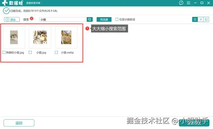 步骤2:软件扫描结束后,如果用户扫描出大量的文件,可以选择直接用【搜索框】直接精准定位目标文件,在【搜索框】中输入目标文件名,就能排除大量无关文件了;
