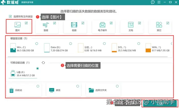 步骤1:打开数据 蛙恢复专家,进入软件的主页面,选好所需文件(即图片)和扫描位置(即照片丢失的位置),点击【扫描】;