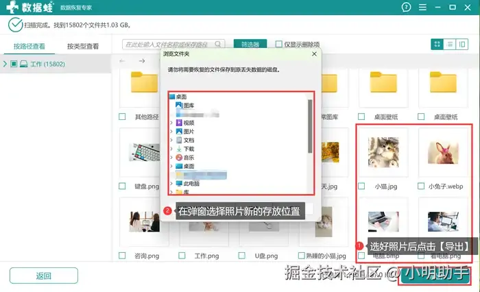 步骤3:选中目标文件,点击【导出】;最后再为恢复照片选好存放位置即可。