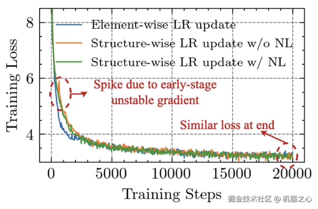 图 1: 结构化梯度缩放与 Adam 的训练损失对比