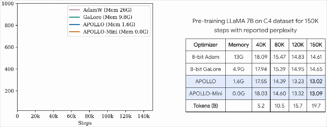在 LLaMA 7B 模型上,APOLLO 系列不仅在内存使用上取得巨大突破,其训练性能也远超过 Adam 以及使用高秩(例如 1024)的 GaLore 方法。