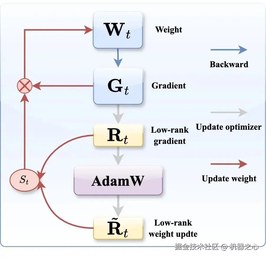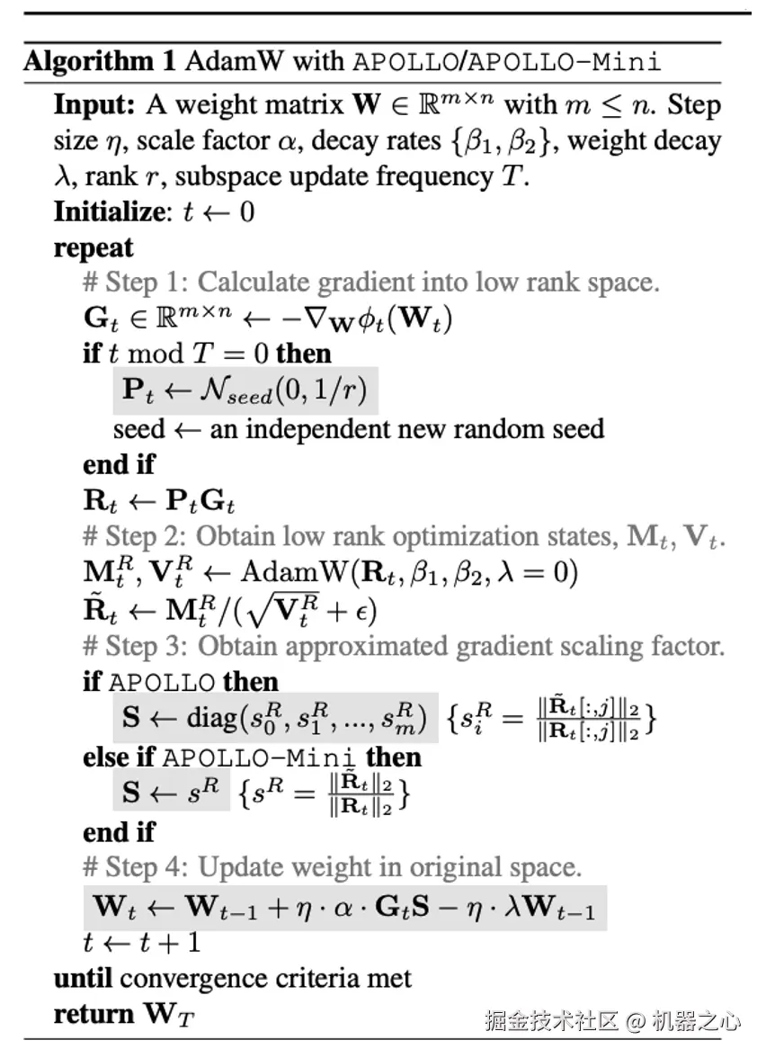 作者提出了 APOLLO,在低秩空间中构造一个辅助优化器状态,用于预测结构化更新的梯度缩放因子(见图 2)。由于优化器状态建立在低秩空间中,其内存占用显著减少。