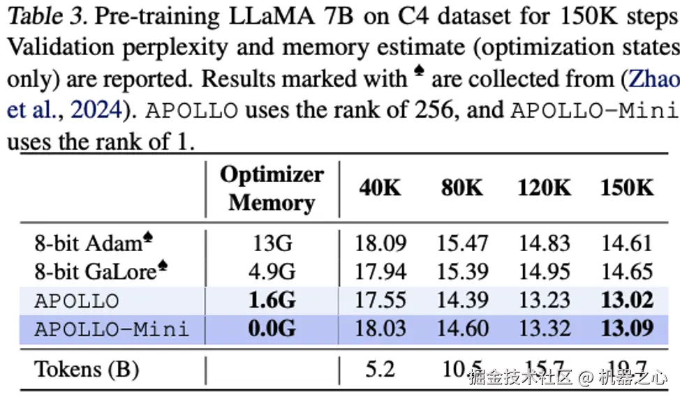 表 2: 使用 C4 数据集预训练 LLaMA-7B 模型验证集困惑度(↓)对比