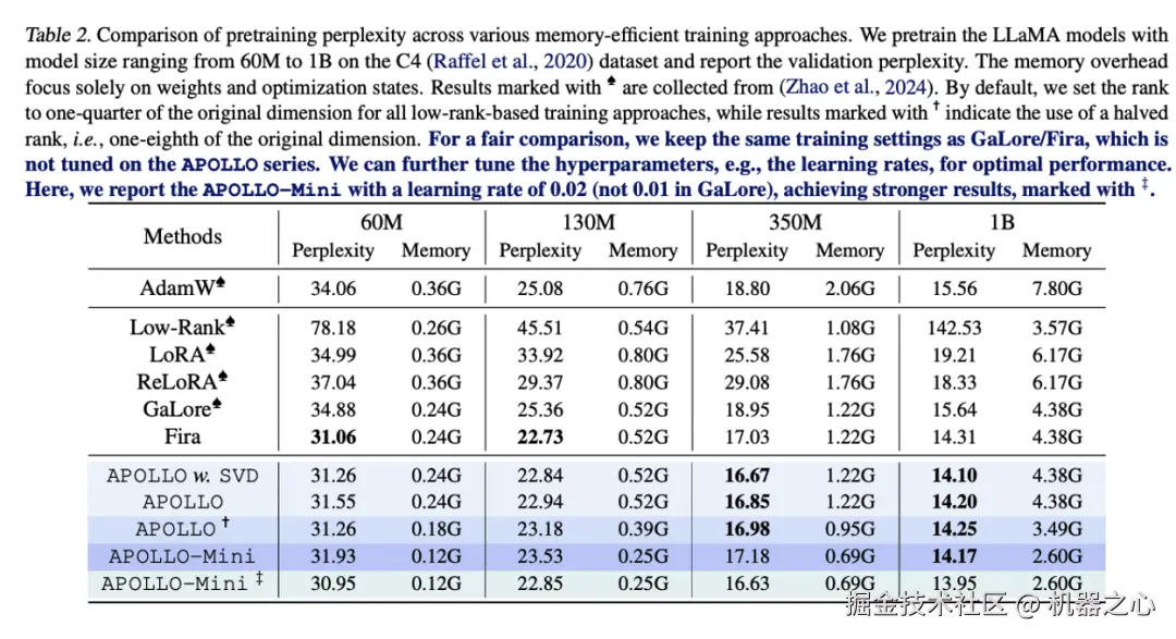 这使得 APOLLO 可通过放缩缩放因子来弥补低秩带来的误差, 从而可采用极低的秩近似,在不牺牲性能的前提下实现极低的内存消耗。实验表明,在 LLaMA-7B 上,APOLLO 仅需 256 的秩,性能仍优于使用 1024 秩的 GaLore。