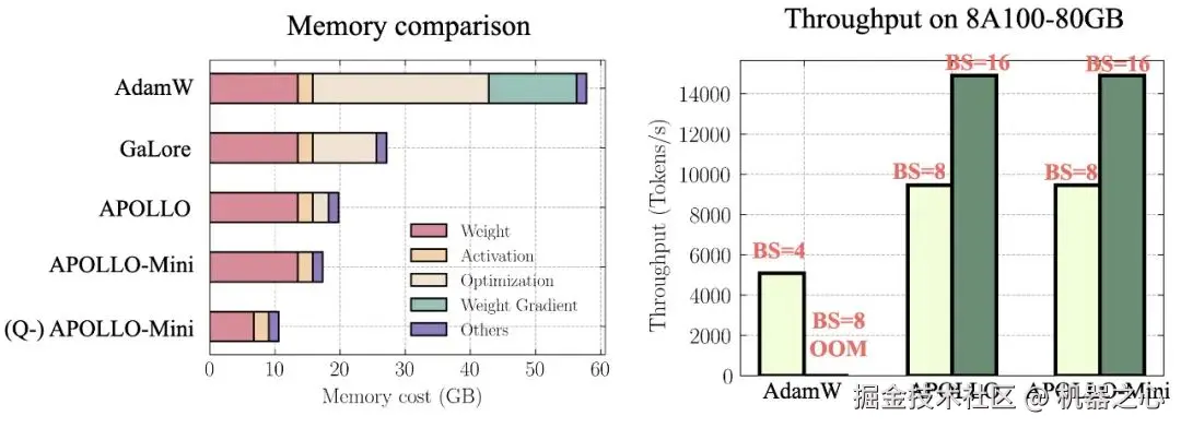 极低内存消耗:首次以类 SGD 内存成本完成大模型训练,达到甚至超越 AdamW 的性能。