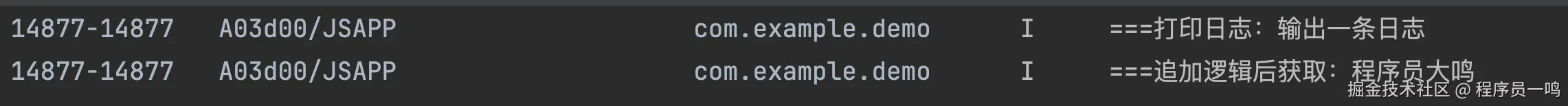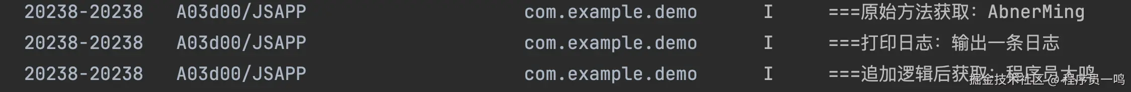 还是上述的案例,我们把util.Aspect.addBefore换成util.Aspect.addAfter,其它逻辑不变,需要注意的是,最终返回值是插入函数执行后的返回值,也就是意味着,最后的打印是addAfter中的函数返回值,我们看下日志: