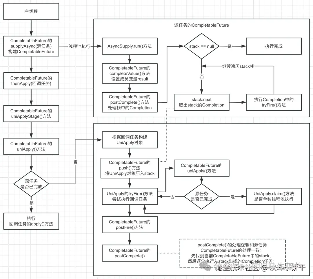 CompletableFuture中的任务完成后即源任务完成后,会通过CompletableFuture.postComplete()方法来完成后置逻辑,也就是把当前CompletableFuture.stack中存储的Completion逐项出栈执行。