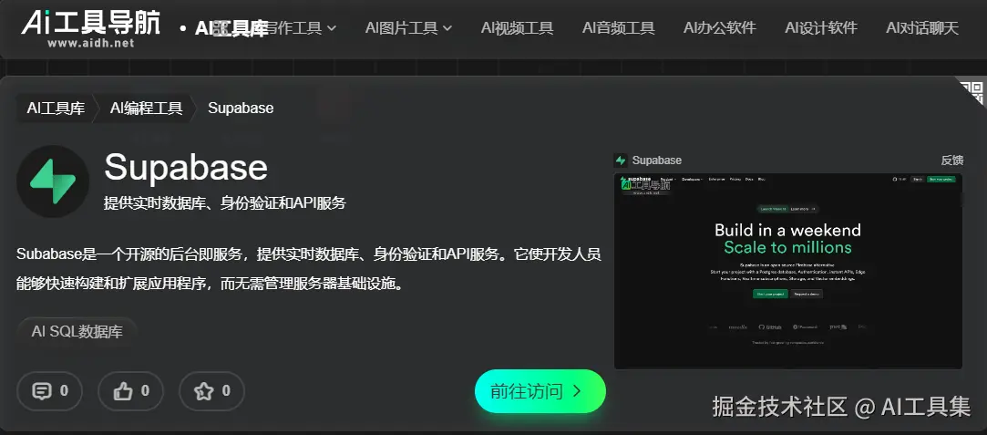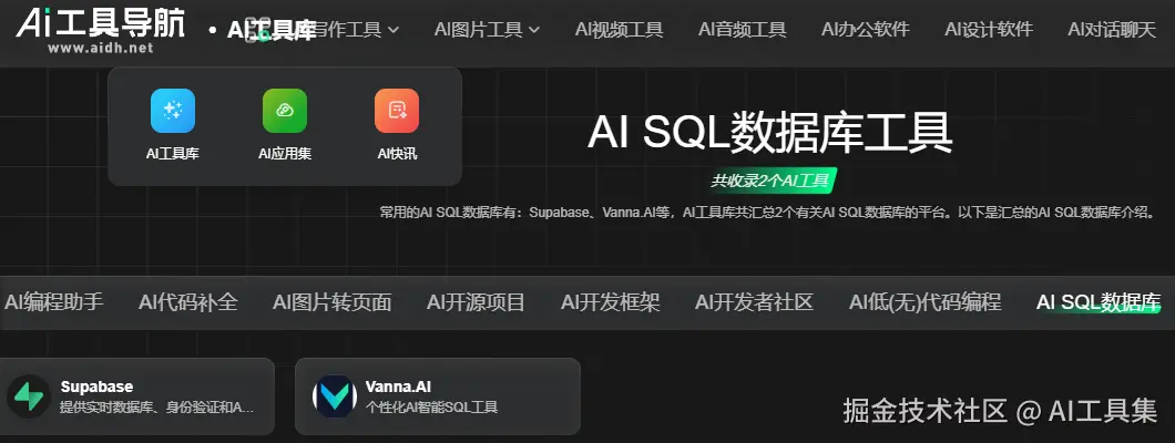 在数据库开发的技术浪潮中,如何提升开发效率、优化数据处理流程,一直是开发者们关注的焦点。 AIDH.NET AI工具库Supabase 和 Vanna.AI两款AI SQL 数据库工具,凭借其独特的技术优势和创新的功能设计,为开发者带来了全新的解决方案,在提升开发效率的同时,也为数据库应用开发注入了新的活力。