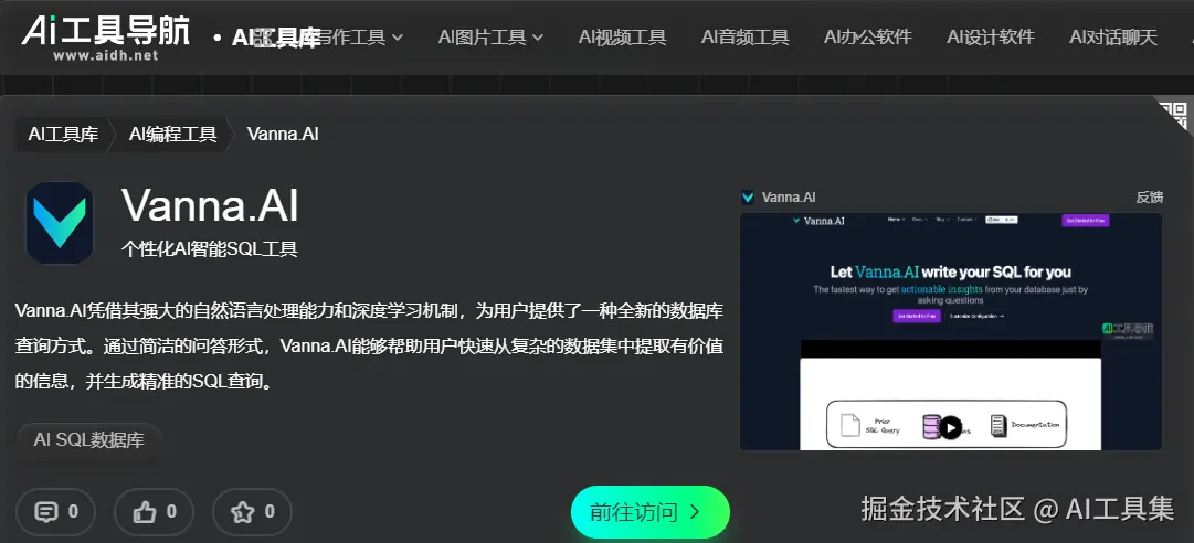 Vanna.AI以其独特的自然语言处理和机器学习技术,打破了传统SQL 查询的技术门槛,为开发者和非技术人员提供了更加便捷的数据查询和分析方式。