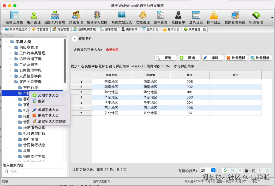 列表包含有有树形列表、条件查询框、通用条件(查询、新增、编辑、删除、导出)等、列表展示、分页导航等内容。这些都是在基类中进行了统一的抽象处理,子类根据需要调整属性或重写相关函数即可实现个性化的界面定义。
