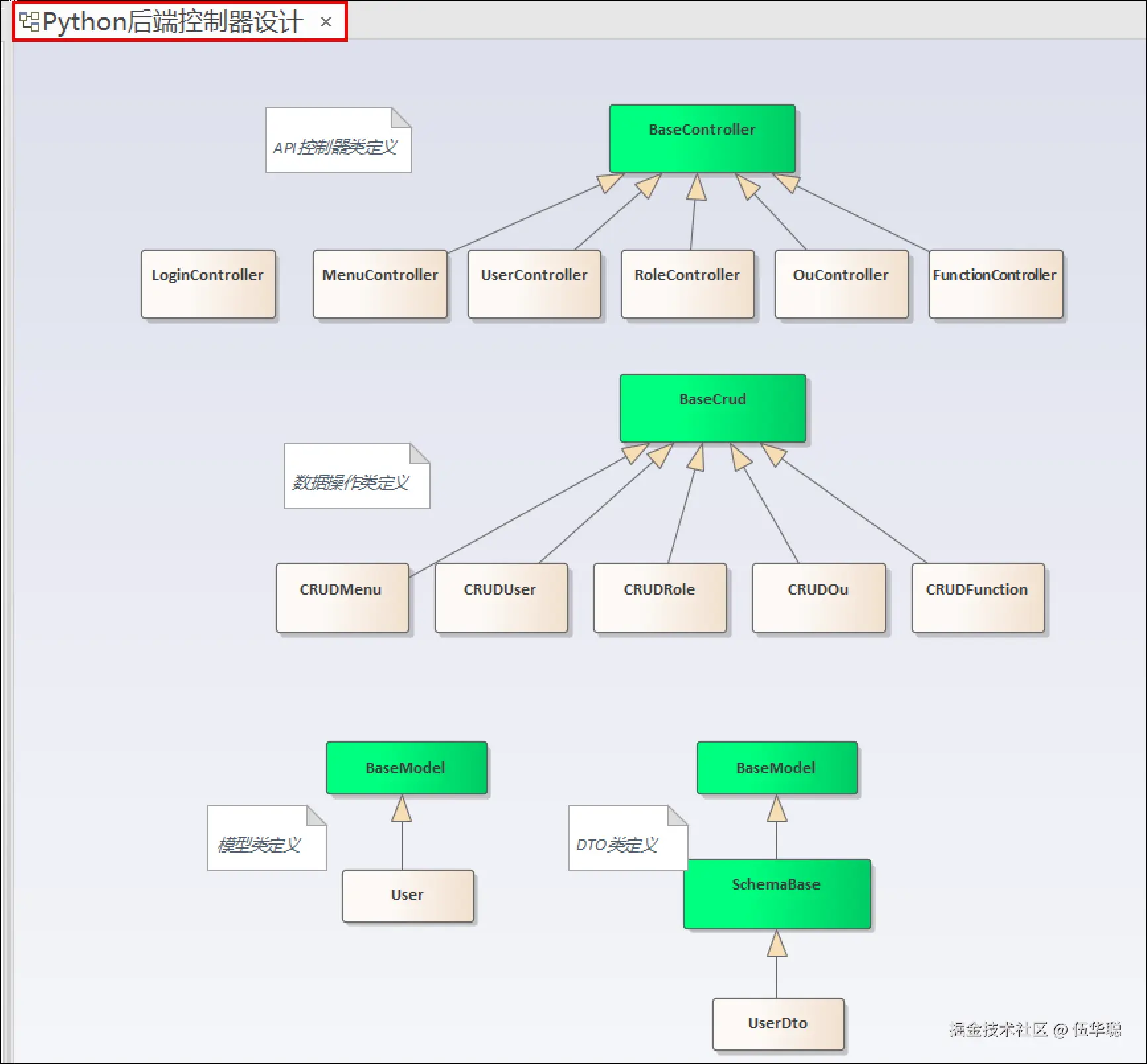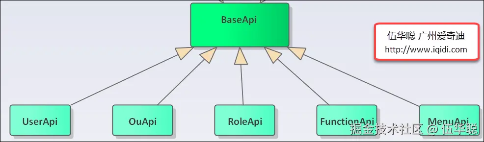 权限模块我们涉及到的用户管理、机构管理、角色管理、菜单管理、功能管理、操作日志、登录日志等业务类,那么这些类继承BaseApi,就会具有相关的接口了,如下所示继承关系。