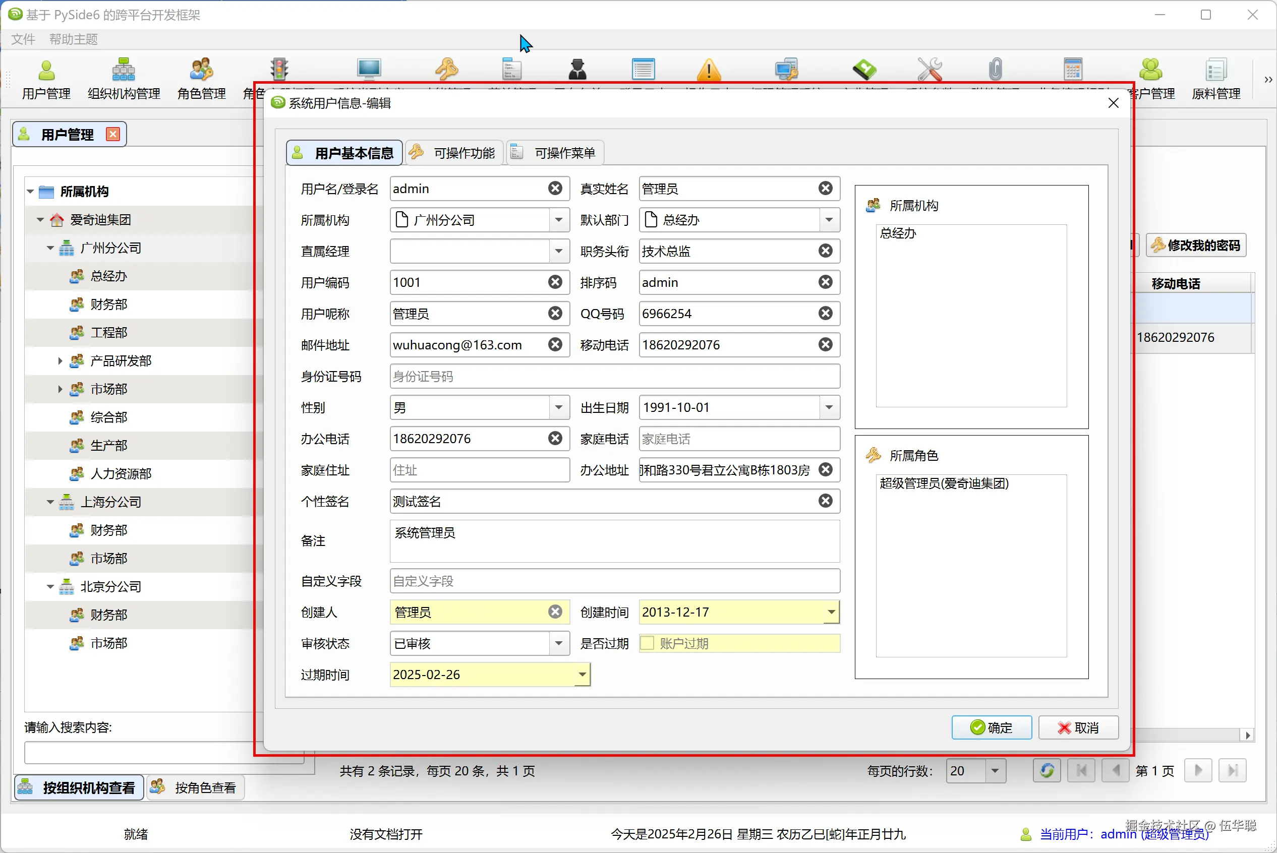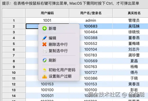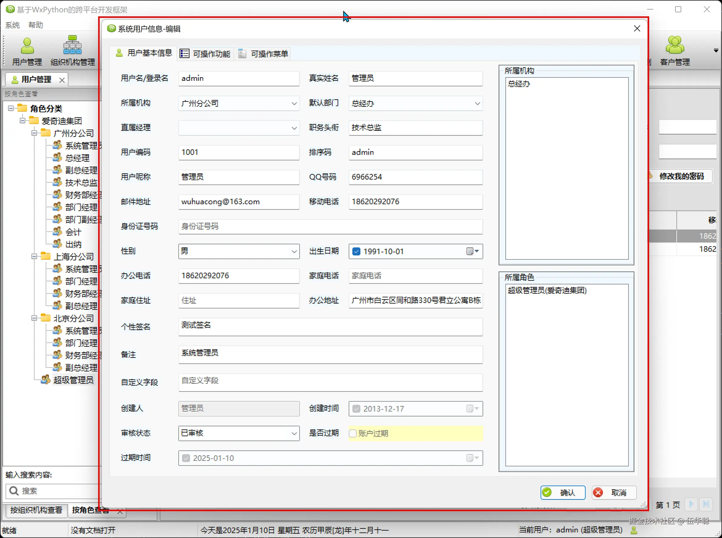 和WxPython的跨平台界面效果一样,该框架也是一个多文档管理界面,其中用户管理界面如下所示。