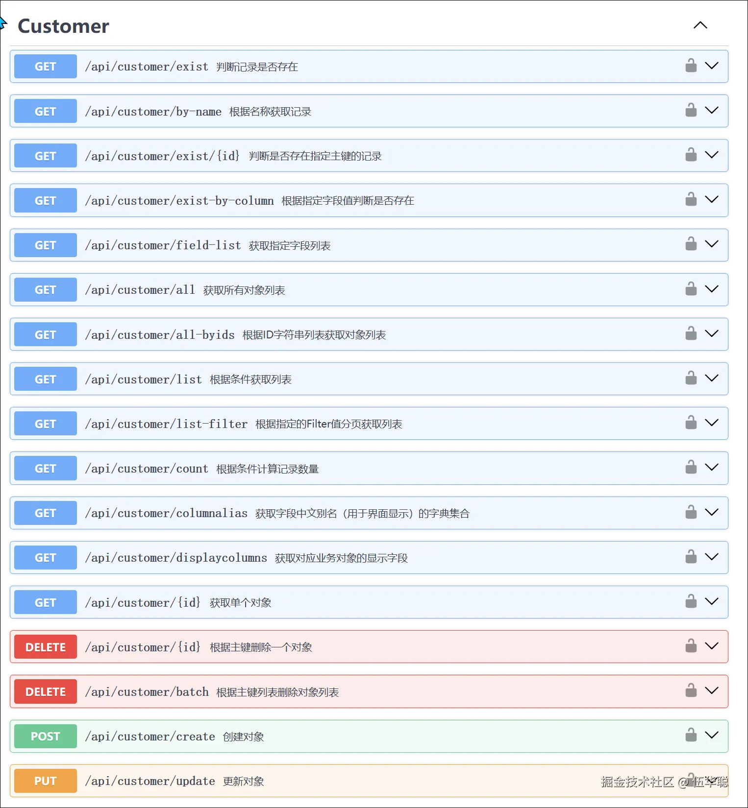 单个模块包含很多通用的接口,通用的接口能满足90%以上的功能需求,以及一些额外的自定义接口。如下是客户信息模块的接口列表。