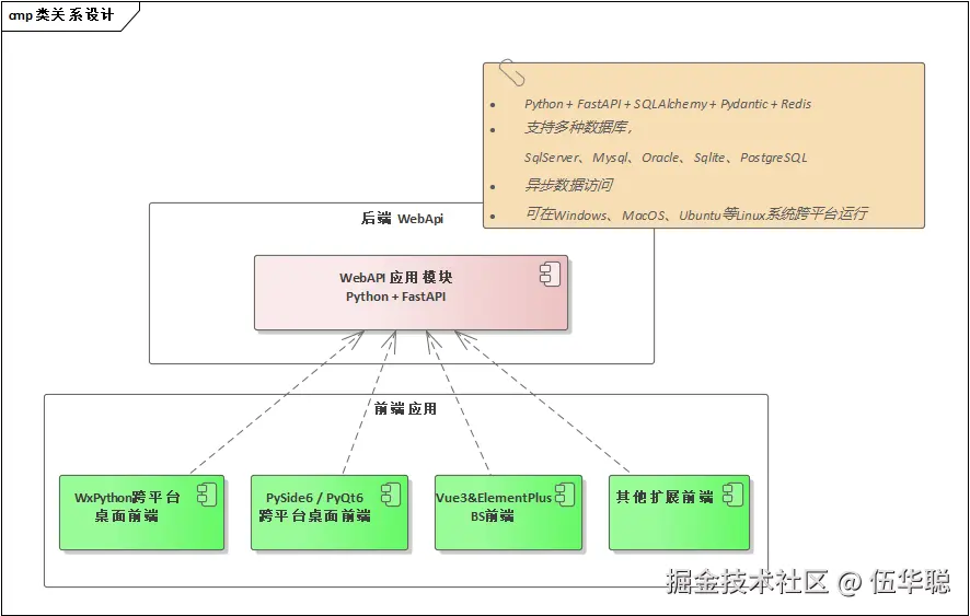 基于PySide6/PyQt6实现的 Python跨平台桌面端GUI框架,和WxPython的跨平台桌面端一样,都是是整个架构体现的一部分,一个Web API中心,同时提供多个接入的终端,如下架构图所示。
