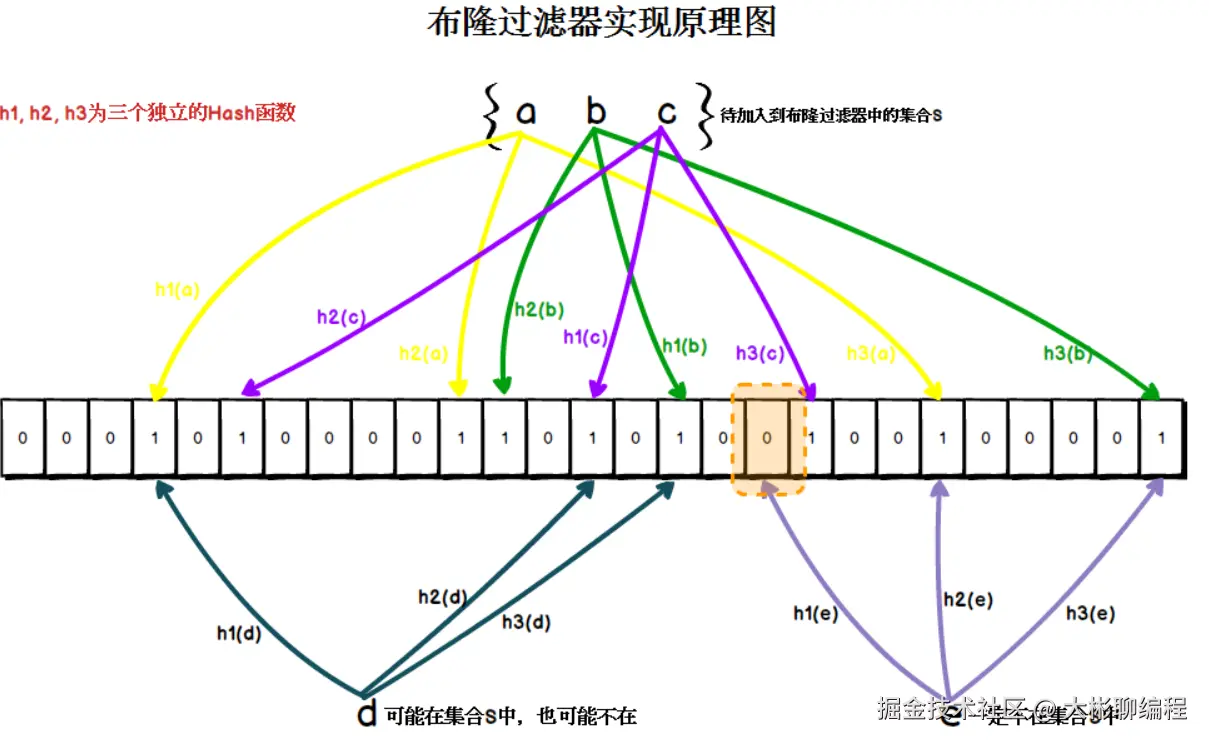 布隆过滤器的核心是一个位数组和多个哈希函数。当我们插入一个元素时,会通过多个哈希函数将其映射到位数组的多个位置,并将这些位置的值设置为 1。查询时,同样通过哈希函数计算出这些位置,如果所有位置的值都是 1,则认为该元素“可能”存在;否则,一定不存在。