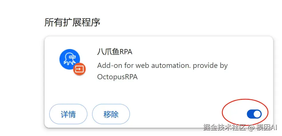 - chrome或edge浏览器安装八爪鱼插件。这里要注意一个点,就是安装后要启用,比如chrome在扩展程序中启用。