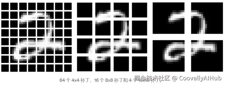 使用Transformer神经网络处理图像的第一步是将其分解为图像块。例如,可以将32x32的图像分解为64个4x4的图像块(每个块包含16个像素)、16个8x8的图像块(每个块包含64个像素)或4个16x16的图像块(每个块包含256个像素):