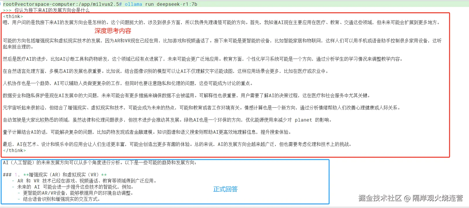 当我们用Ollama运行DeepSeek R1模型,向它提问时,会发现它的回答里是有think标签的