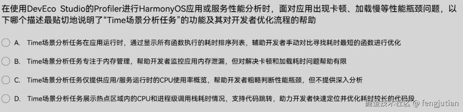 在使用DevEcoStudio的Profler进行HarmonyOS应用或服务性能分析时,面对应用出现卡顿,加载慢等性能瓶颈问题,以下哪个描述最贴切地说明了"Time场景分析任务"的功能及其对开发者优化流程的帮助?