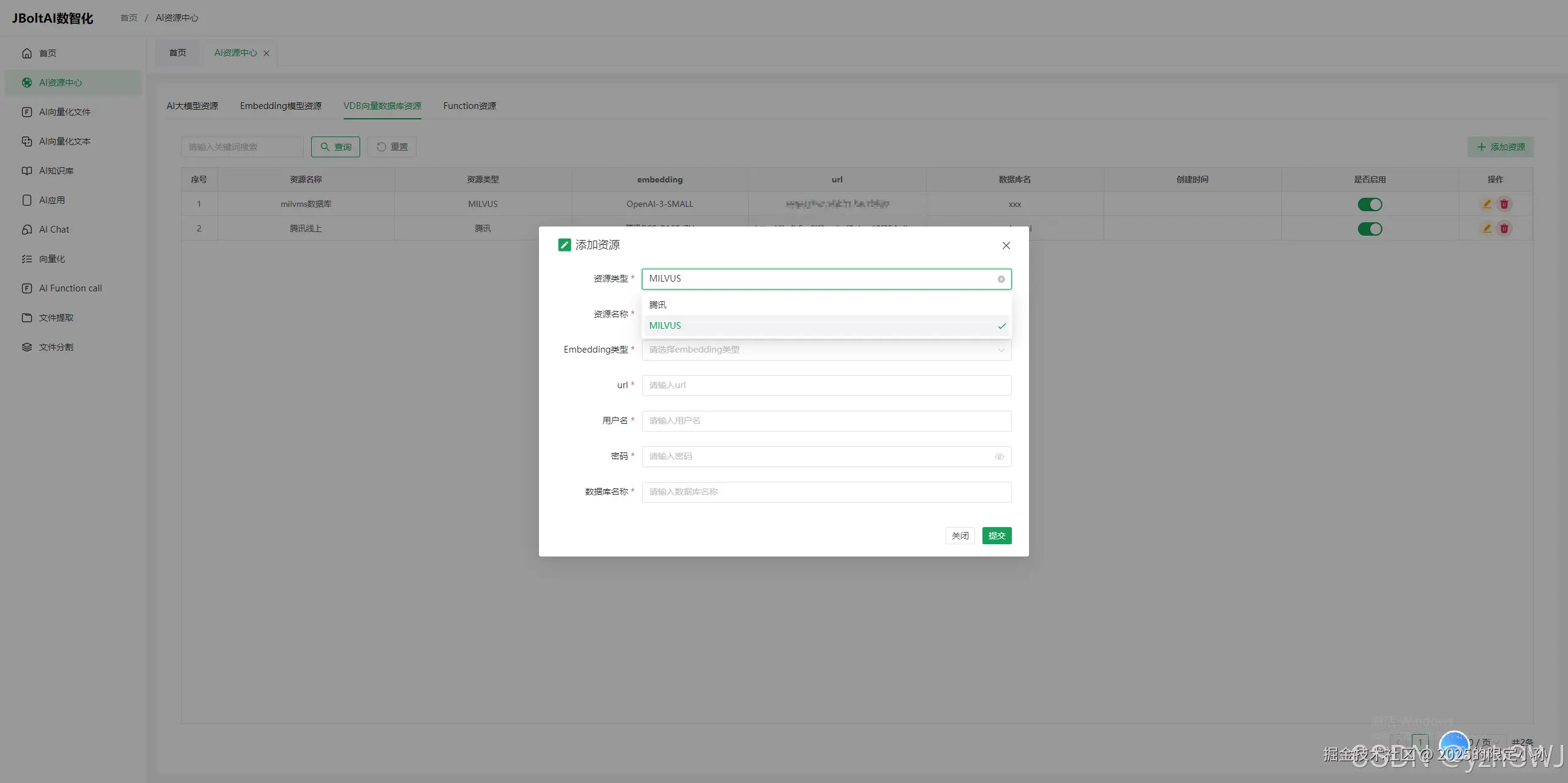 JBoltAI_SpringBoot 资源管理功能可以分为三个部分:AI 资源管理、VDB 资源管理和 Embedding 资源管理。