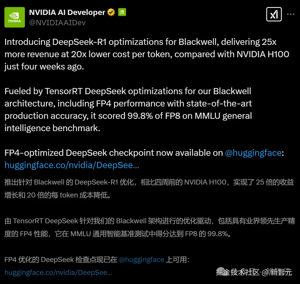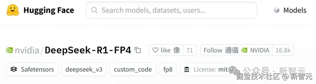 目前,英伟达基于 FP4 优化的 DeepSeek-R1 检查点现已在 Hugging Face 上开源。