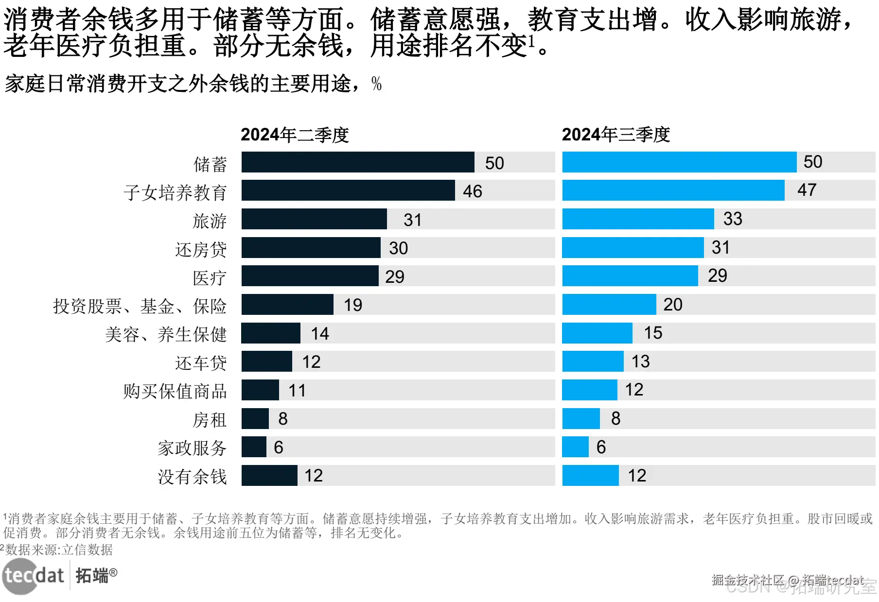消费者家庭余钱主要用于储蓄、子女培养教育、旅游、还房贷和医疗;消费者储蓄意愿持续增强,尤其是消费意愿高的群体;消费者家庭子女培养教育支出增加;收入高低对旅游需求影响较大;老年消费者医疗负担相对较重;股市回暖可望对促进消费产生助力;没有余钱的消费者比重上升值得关注。