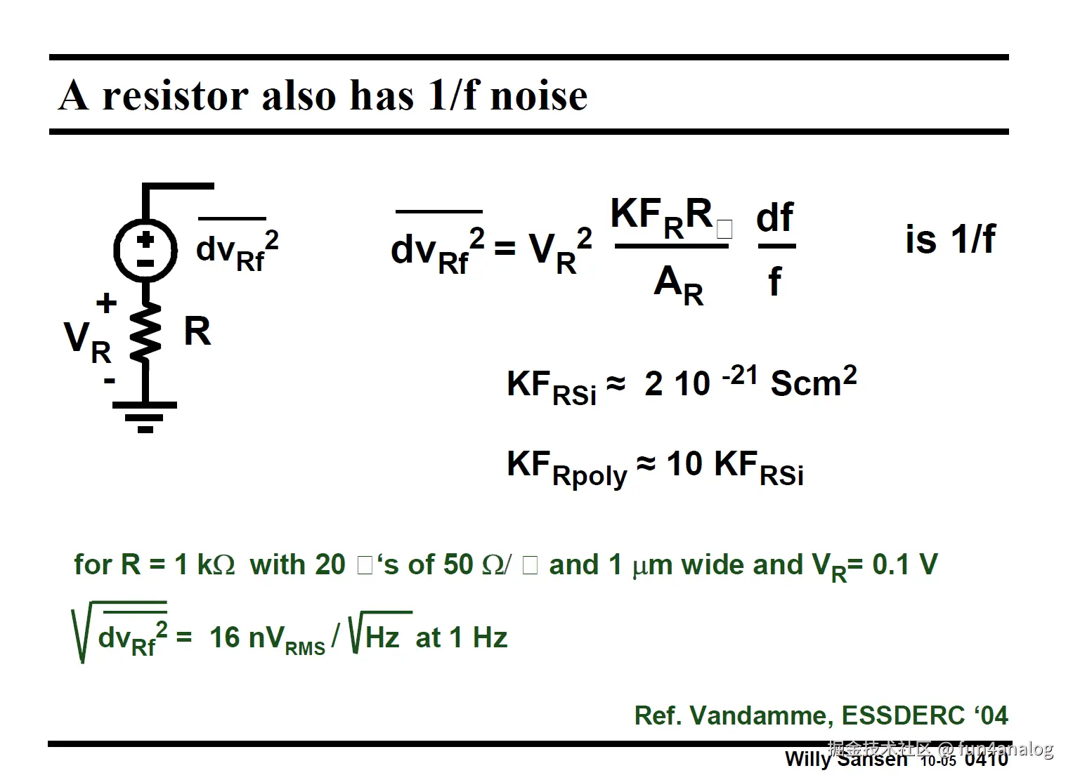 电阻也有1/f噪声, 即低频噪声, 可用加入电容用RC滤波滤掉.