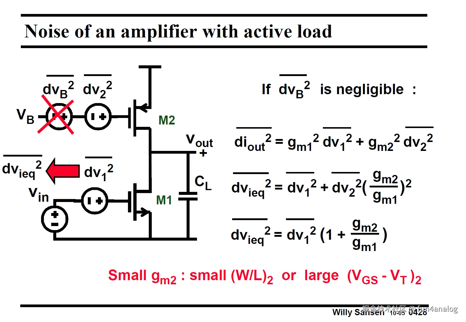 M1为放大管, M2为负载管. 等效输入噪声 为gm2/gm1. 因此M2的gm2要小, 即(W/L)小, Vgs2-Vth大. 并且M1的gm1要大.