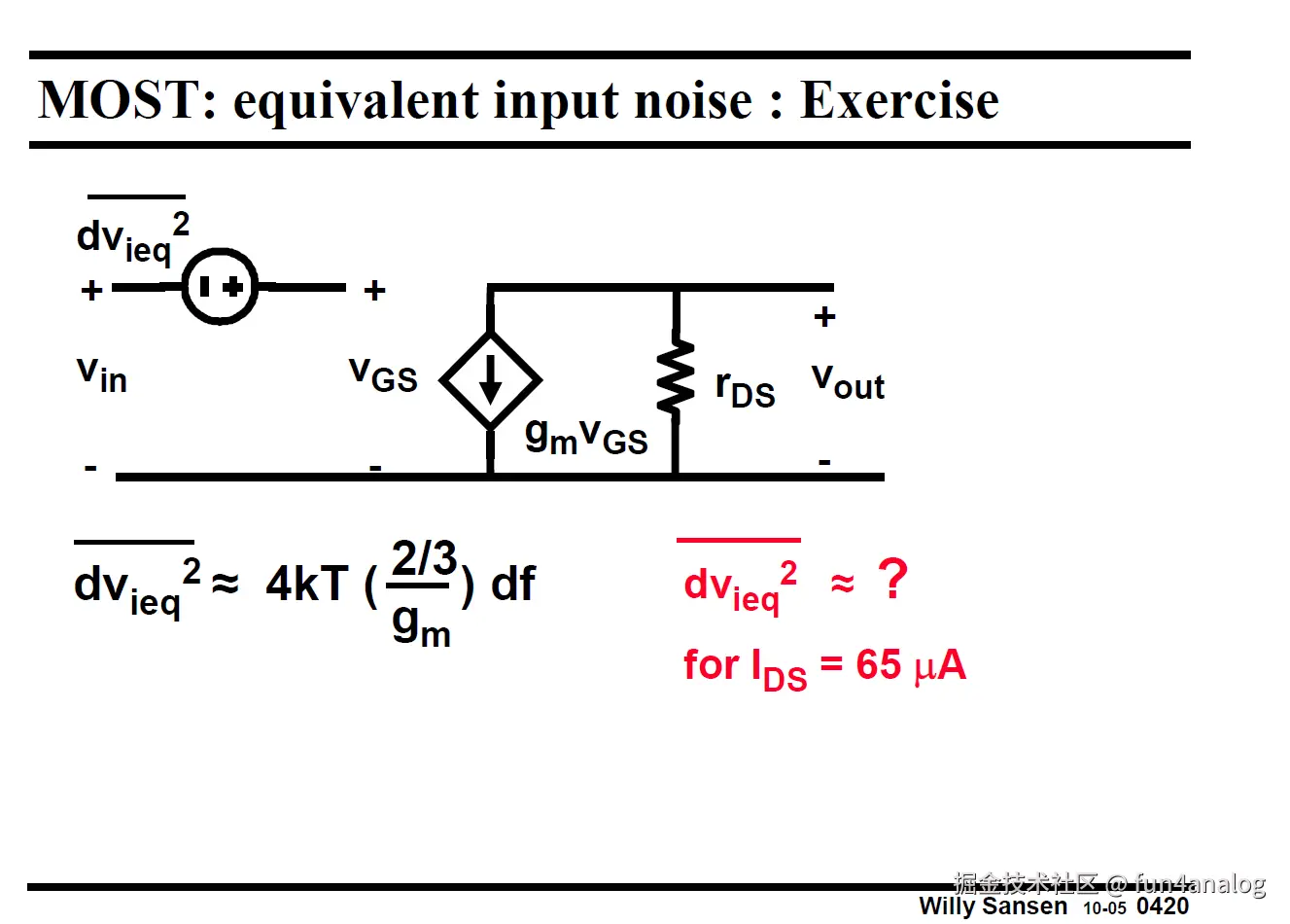 MOS的source串上degenerated resistor R, 其等效电流噪声为4kT/R, 电压噪声为4kT R