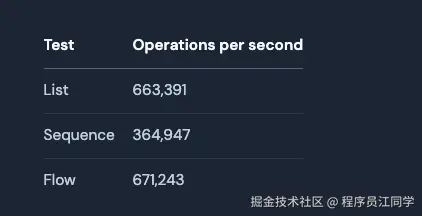 数据对比后可以发现,Sequences 在速度上相比 Collections 并没有什么优势,由于其懒加载特性,Sequences 在内存占用上应该会更优。因此当考虑性能时,应根据具体场景选择合适的集合模型。
