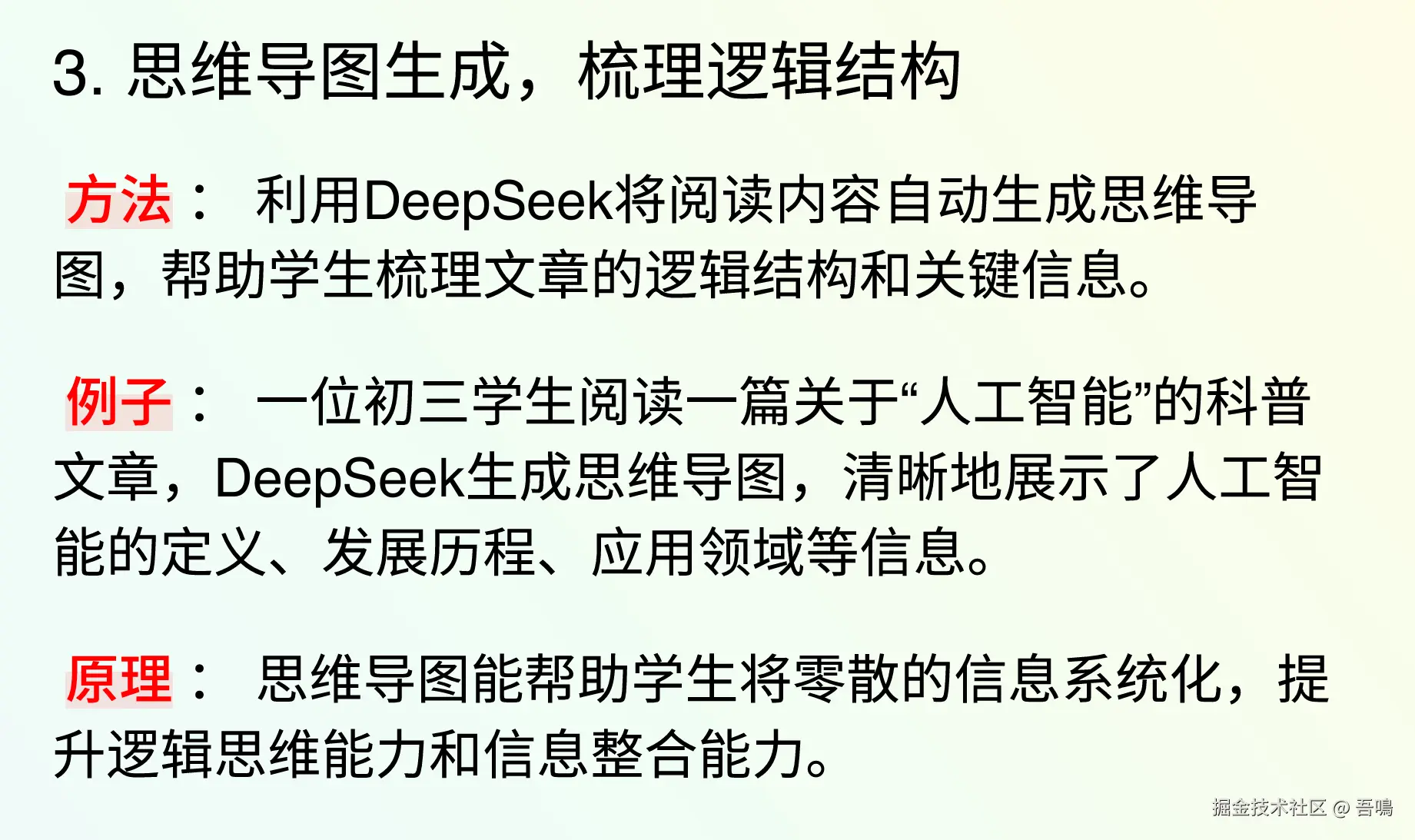 我觉得这份指导手册的内容整理的非常好,基本上如果你家小孩有些学习上的问题,都可以对号入座,找到对应的DeepSeek提问技巧。、