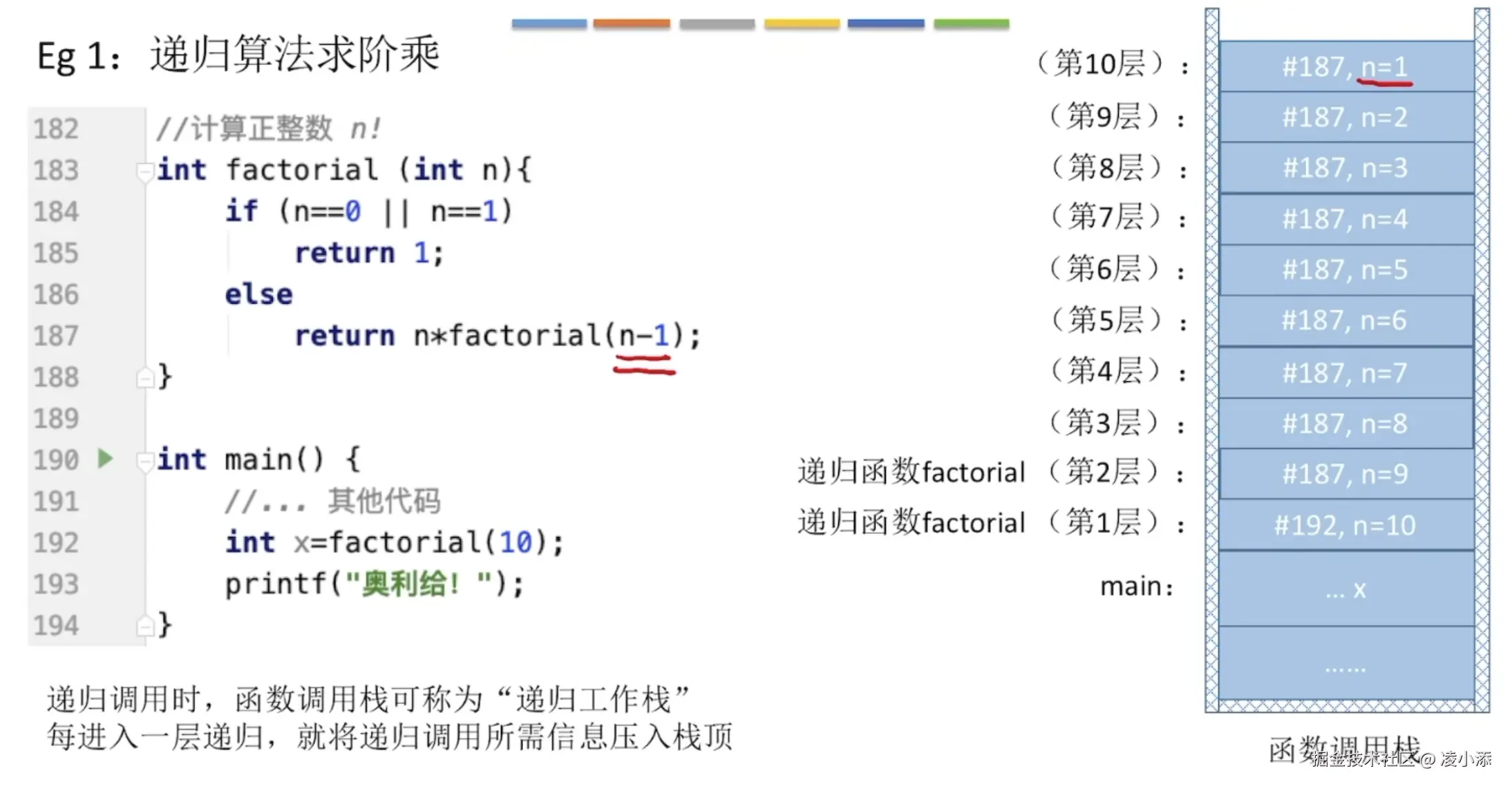 5!的计算是 12345,例子中则是从 5 开始,每次调用自身,但是每次的值都减 1,累乘到 1 结束。