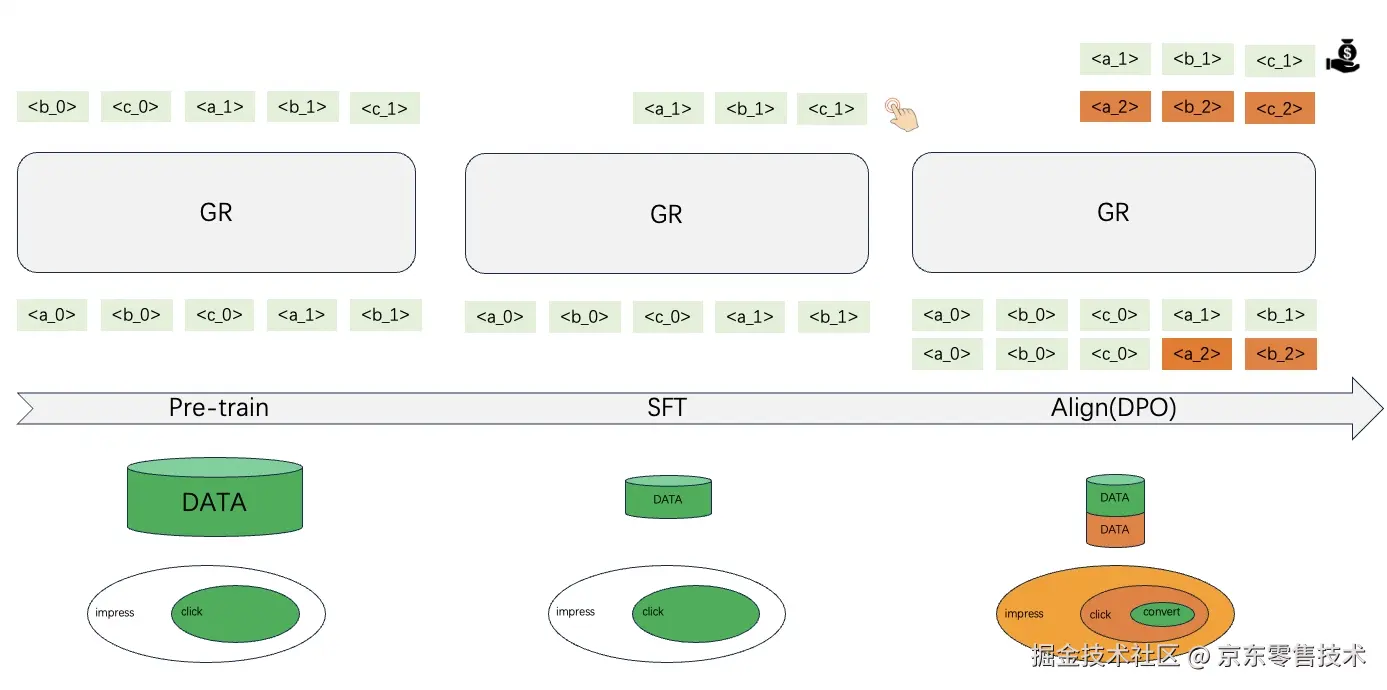 在Pre-train阶段,我们通过海量的点击行为数据,让模型去记忆和理解用户的各种行为习惯,为模型注入知识。接着在SFT阶段,我们使用小量的数据,让模型在用户的近期行为上进行微调,让模型适应用户行为分布的微小改变。