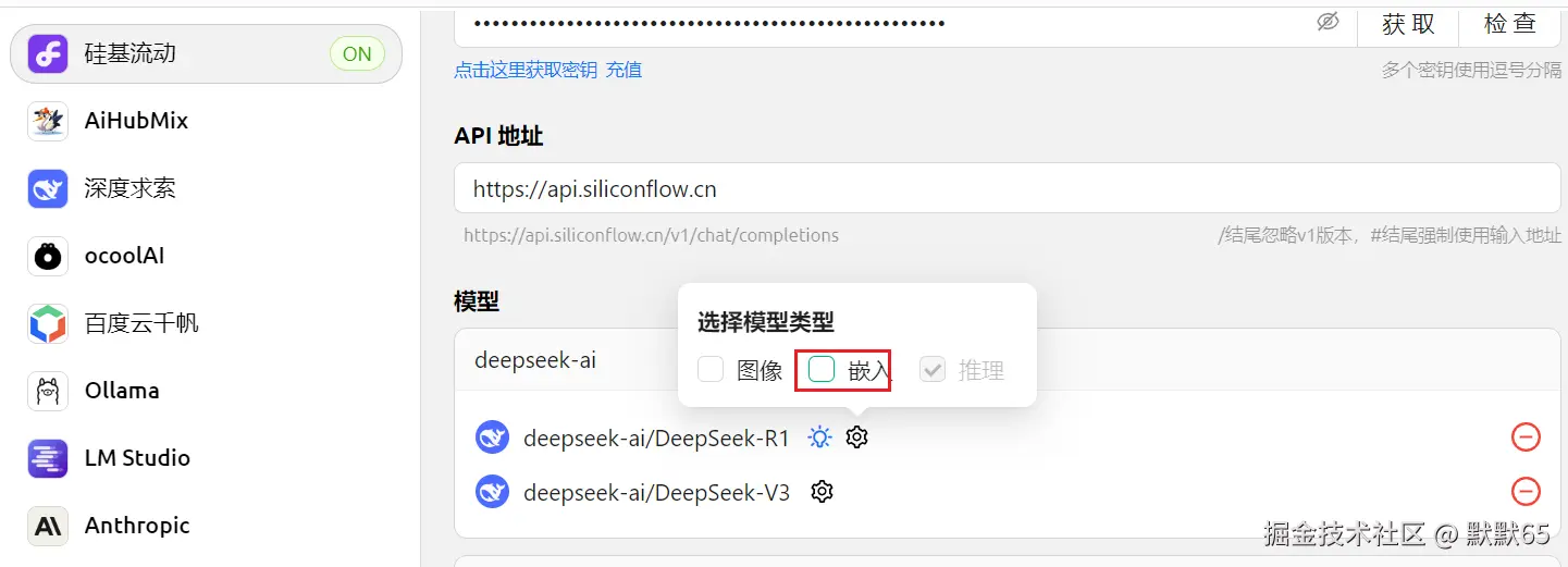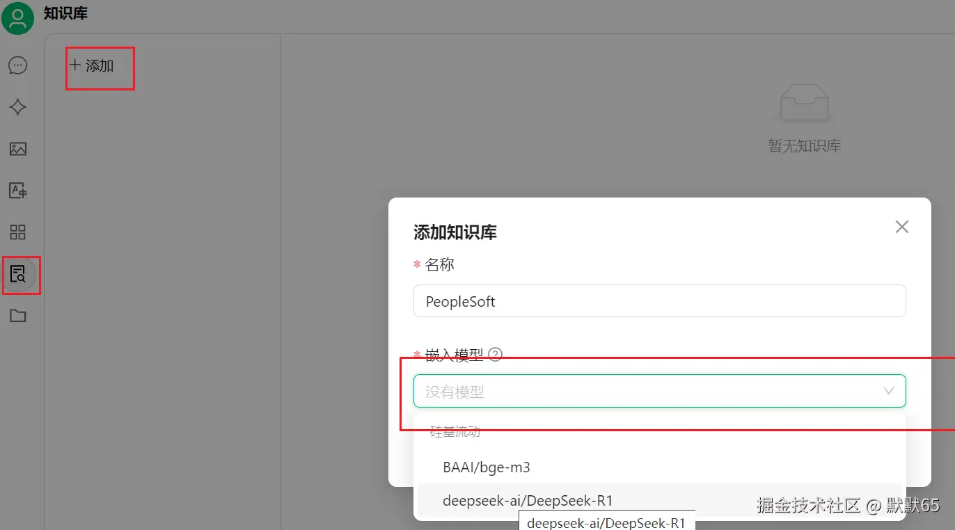 选择BAAI/bge-m3 模型,刚才阿里云也行,我搞错了,Deepseek R1 不能设置为嵌入模型