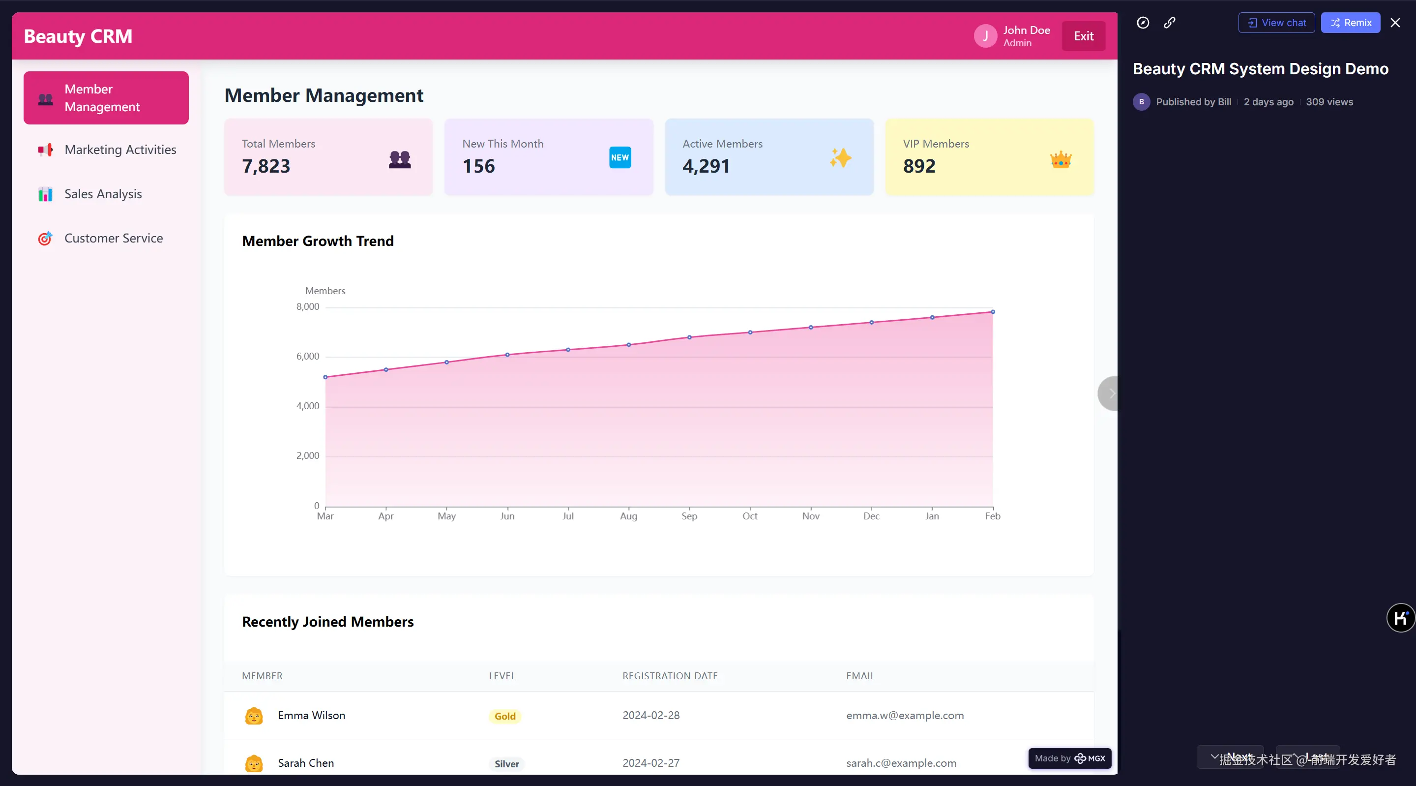 例如,这是某用户生成的后台系统的 Demo, 其中包含了各种交互功能的实现